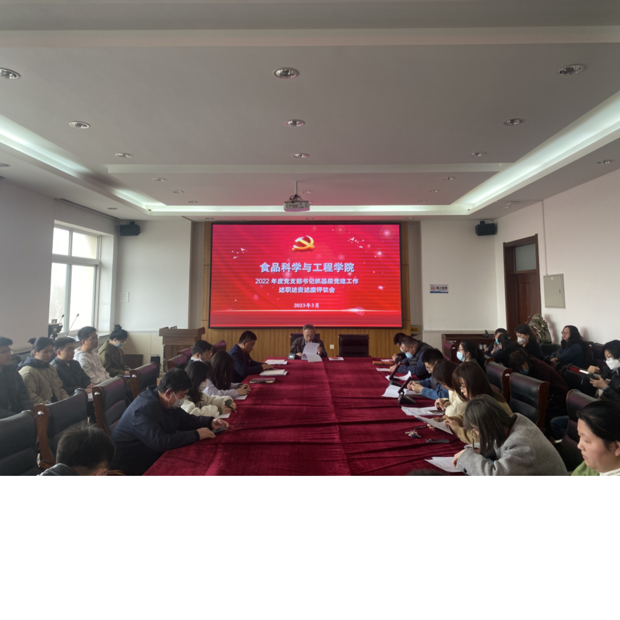 按照学校党委的统一安排,3月22日下午,食品科学与工程学院党委2022年度党支部书记述职述责述廉评议会议在理工楼三楼会议室召开。学院党委书记王志江主持会议并作点评讲话,学院党委成员、师生党员代表参加会议。